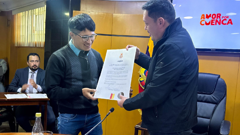 El joven Damián Marcelo Duchi Durán fue homenajeado este jueves, 9 de enero de 2025, por la Alcaldía de Cuenca debido a su heroica acción al salvar a dos niñas que habían caído al río Yanuncay el pasado 2 de enero.