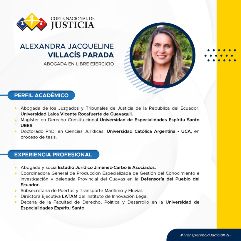 - Alexandra Villacís Parada es doctora en Ciencias Jurídicas y ha trabajado como abogada en los juzgados de Ecuador.