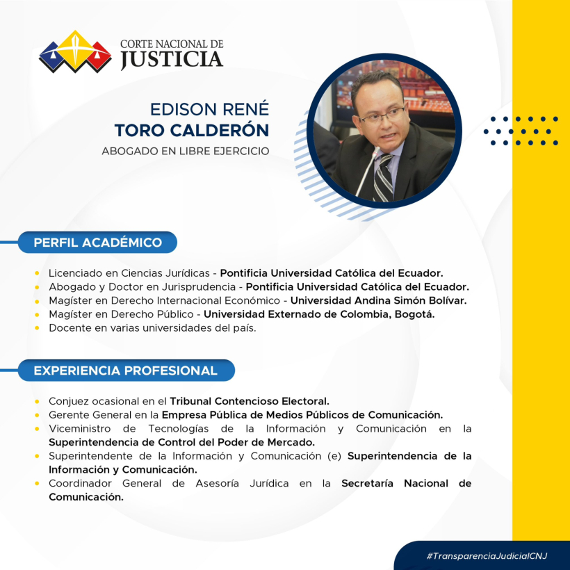 - Edison Toro Calderón es magíster en Derecho y ha sido conjuez ocasional del Tribunal Contencioso Electoral.