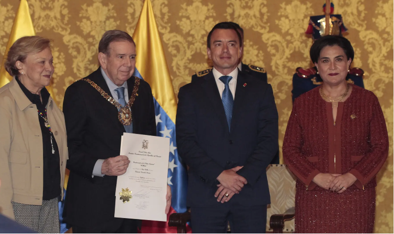 El presidente ecuatoriano Daniel Noboa condecoró este martes 28 de enero de 2025 al líder opositor venezolano Edmundo González Urrutia con la Orden Nacional al Mérito en el grado de Gran Collar, durante una ceremonia celebrada en el Palacio de Carondelet, en Quito.
