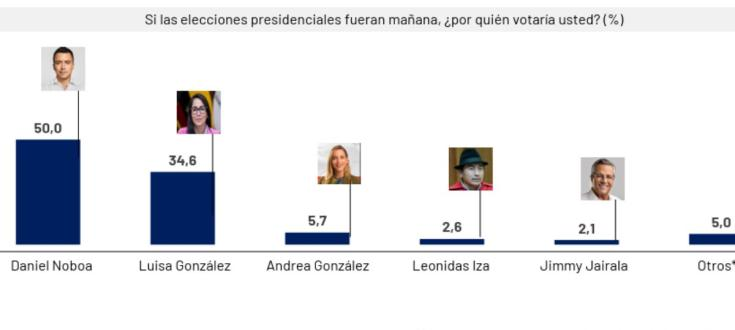 Según Ipsos, una de las encuestadoras más reconocidas del país, Daniel Noboa lidera con un 45,3% de los votos válidos frente a un 31,3% de Luisa González. Estas cifras proyectan que Noboa podría alcanzar el 50% necesario para ganar en primera vuelta, considerando que el Código de la Democracia establece que debe haber al menos 10 puntos de diferencia entre el primer y segundo lugar. Sin embargo, otras encuestadoras presentan panoramas menos concluyentes.