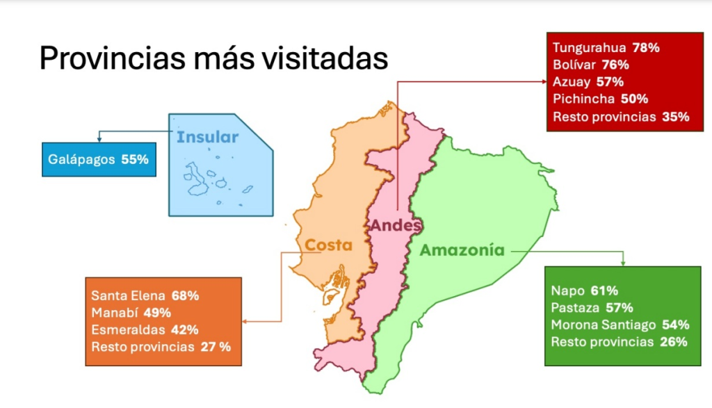 En el documento, explica que durante estos días de asueto, este año se contabilizaron 1,2 millones de viajes turísticos en todo el país, lo que significa un crecimiento del 18% en los desplazamientos, en relación al año anterior. Las provincias que recibieron mayor cantidad de turistas fueron Tungurahua (78%), Bolívar (76%), Santa Elena (68%), Napo (61%), Azuay y Pastaza (57%).